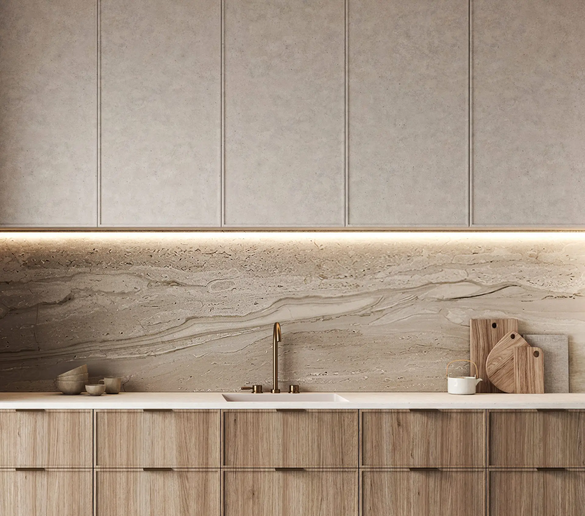 Sable modernise la porte classique à cinq pièces avec des montants et traverses ultra-étroits, laissant le placage de bois véritable occuper le devant de la scène. Sa teinte claire et neutre et son veinage fin et droit ajoutent une texture organique sans alourdir visuellement. Choisissez un fil vertical ou horizontal sur les portes et panneaux pour accentuer la hauteur ou la largeur, et combinez avec des tiroirs à façade lisse (slab) pour une ligne épurée. Le résultat : une interprétation Shaker fraîche et moderne, qui demeure chaleureuse, durable et facile à marier.