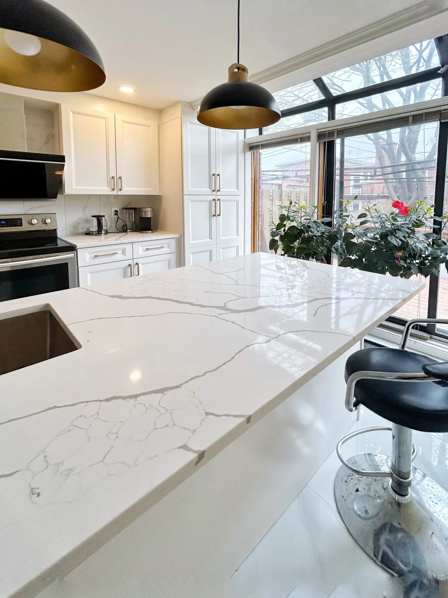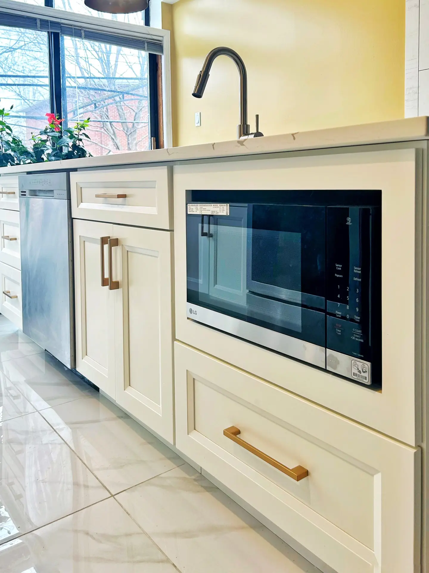 Les propriétaires ont opté pour un carrelage en céramique légèrement texturé, avec des touches de beige. Ces carreaux s’harmonisent parfaitement avec les armoires en bois et créent un joli contraste, évitant la monotonie d’un sol blanc traditionnel. Leur finition mate permet aussi d’équilibrer la brillance présente dans la pièce.