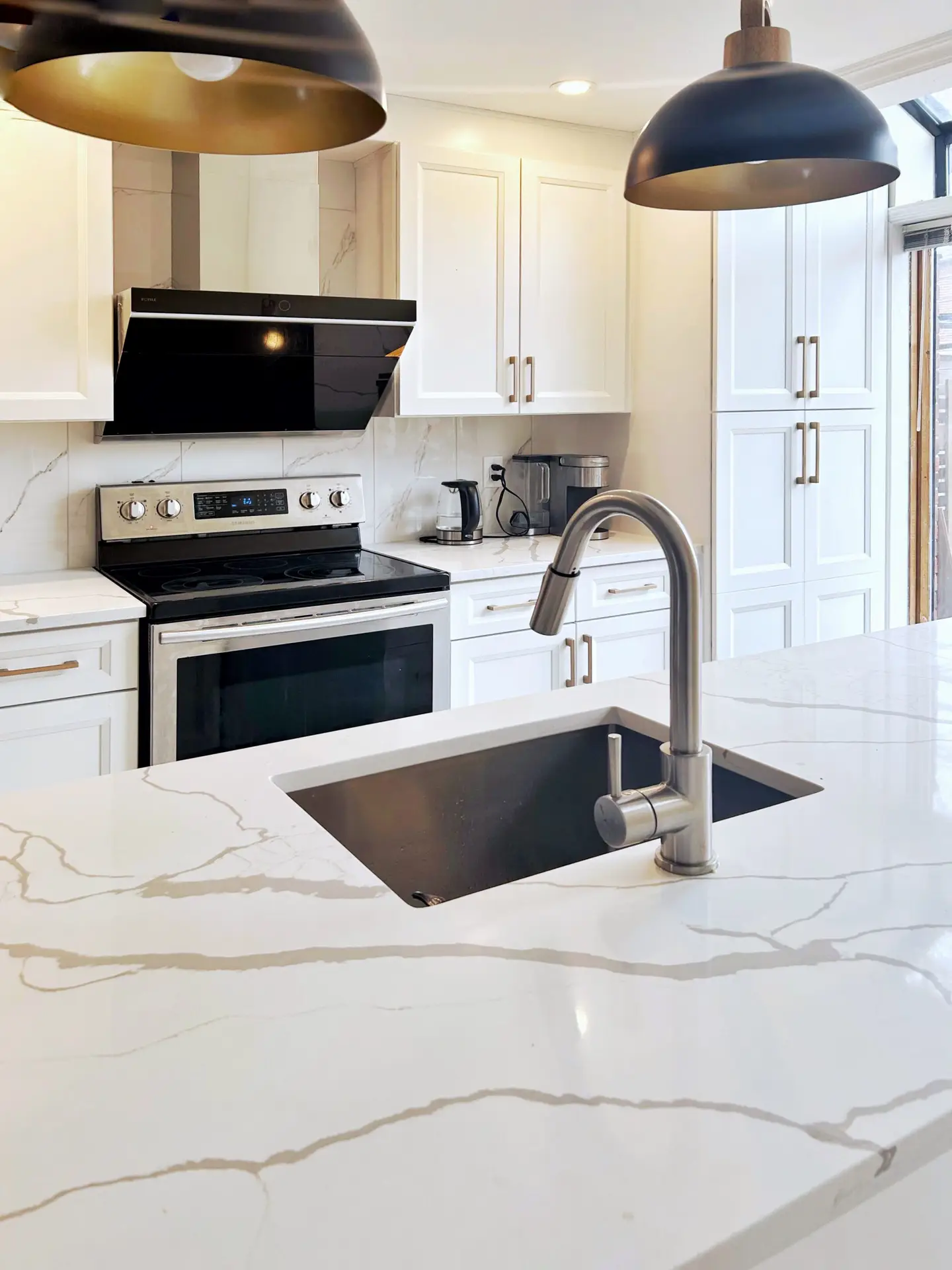 Pour faire place aux nouveaux matériaux, les vieilles armoires en bois à lattes branlantes, les carreaux de céramique vintage, les comptoirs en stratifié tachés et les robinets de travers ont été retirés de la scène.