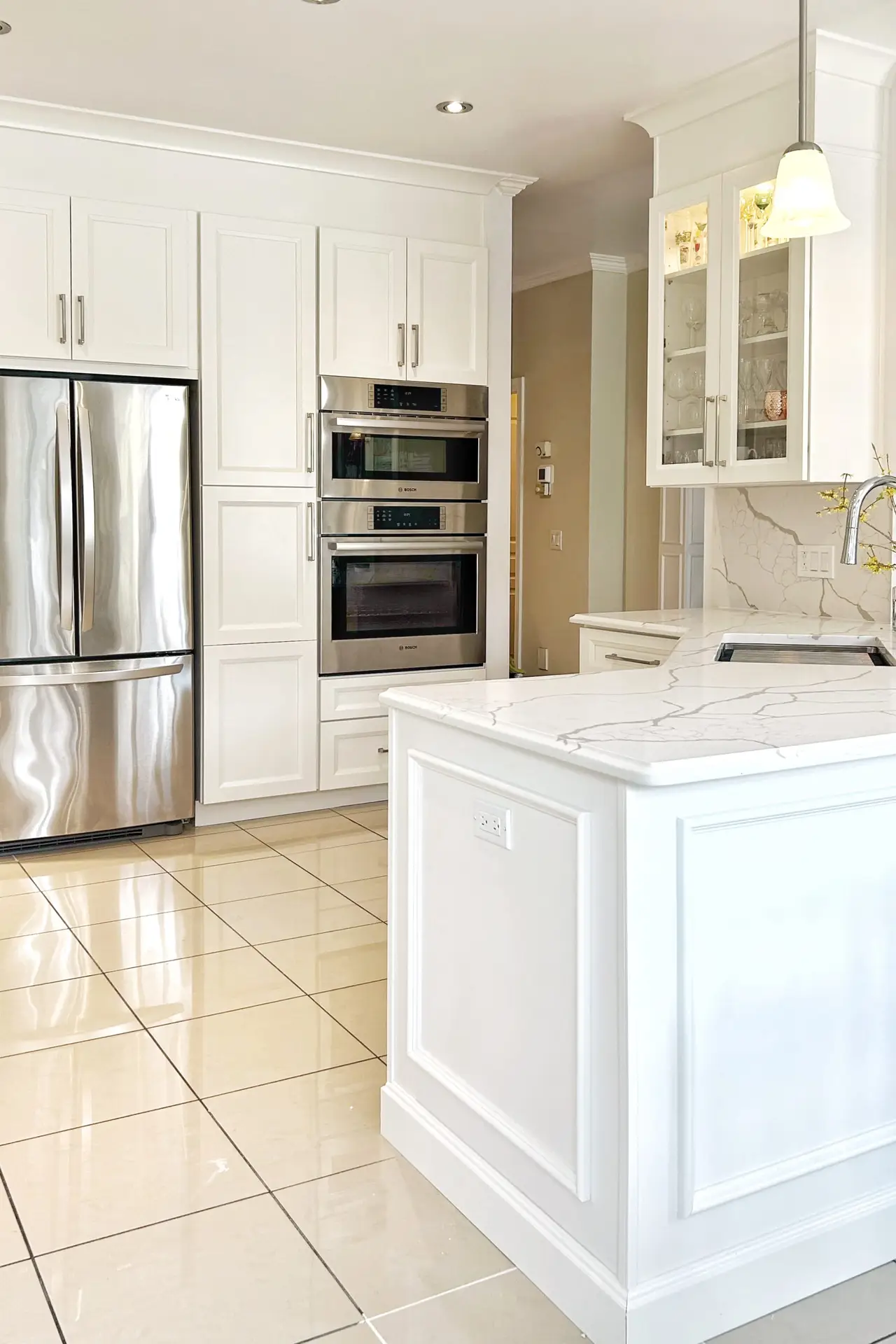 Les propriétaires ont choisi des carreaux de céramique pour le plancher, légèrement texturés et mouchetés de beige. Ils s’harmonisent parfaitement avec les armoires en bois et créent un contraste intéressant, évitant la monotonie qu’un plancher blanc traditionnel peut apporter. Leur fini mat contribue aussi à équilibrer la brillance de la pièce. Les jours des carreaux orange vif dans cette cuisine sont révolus !