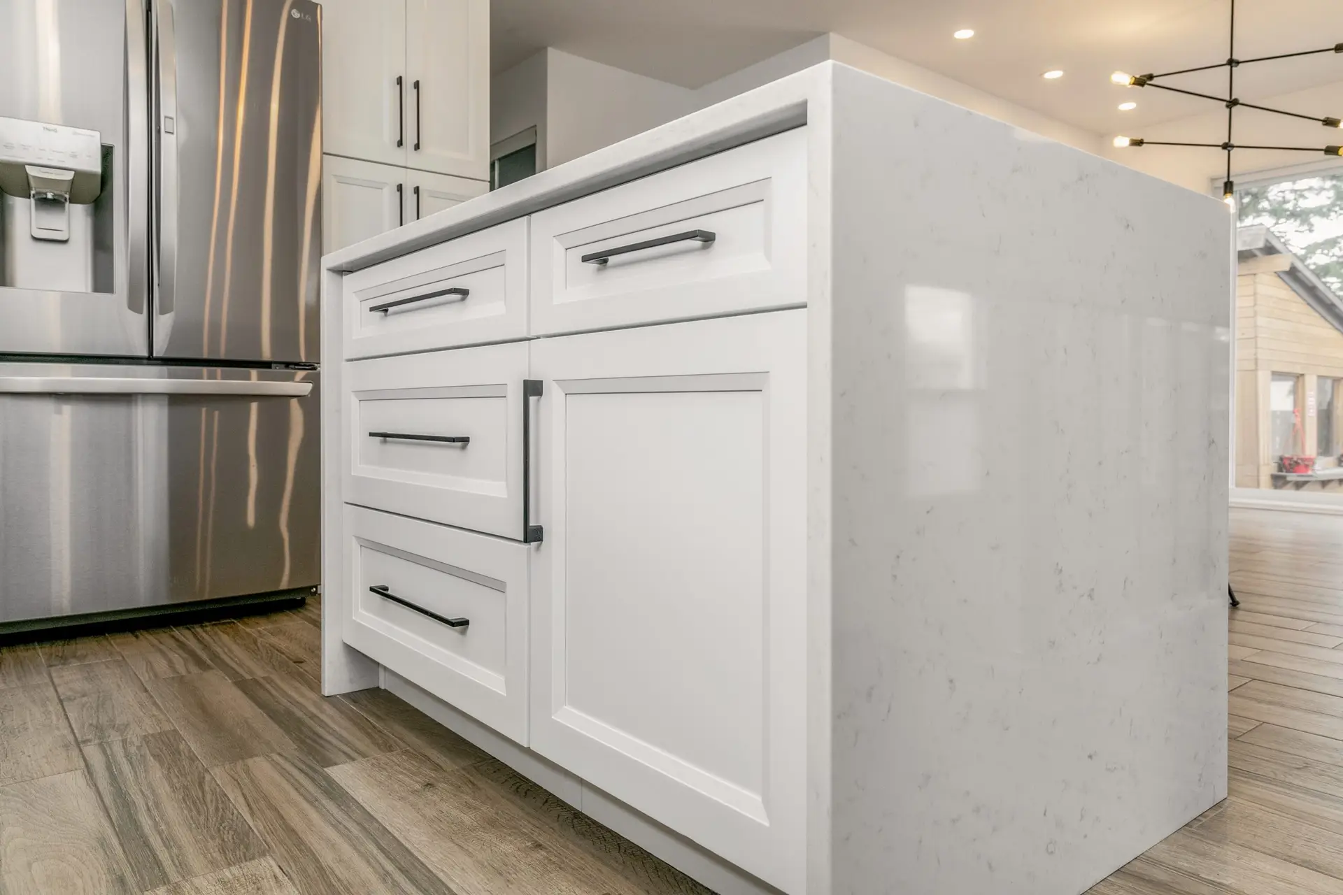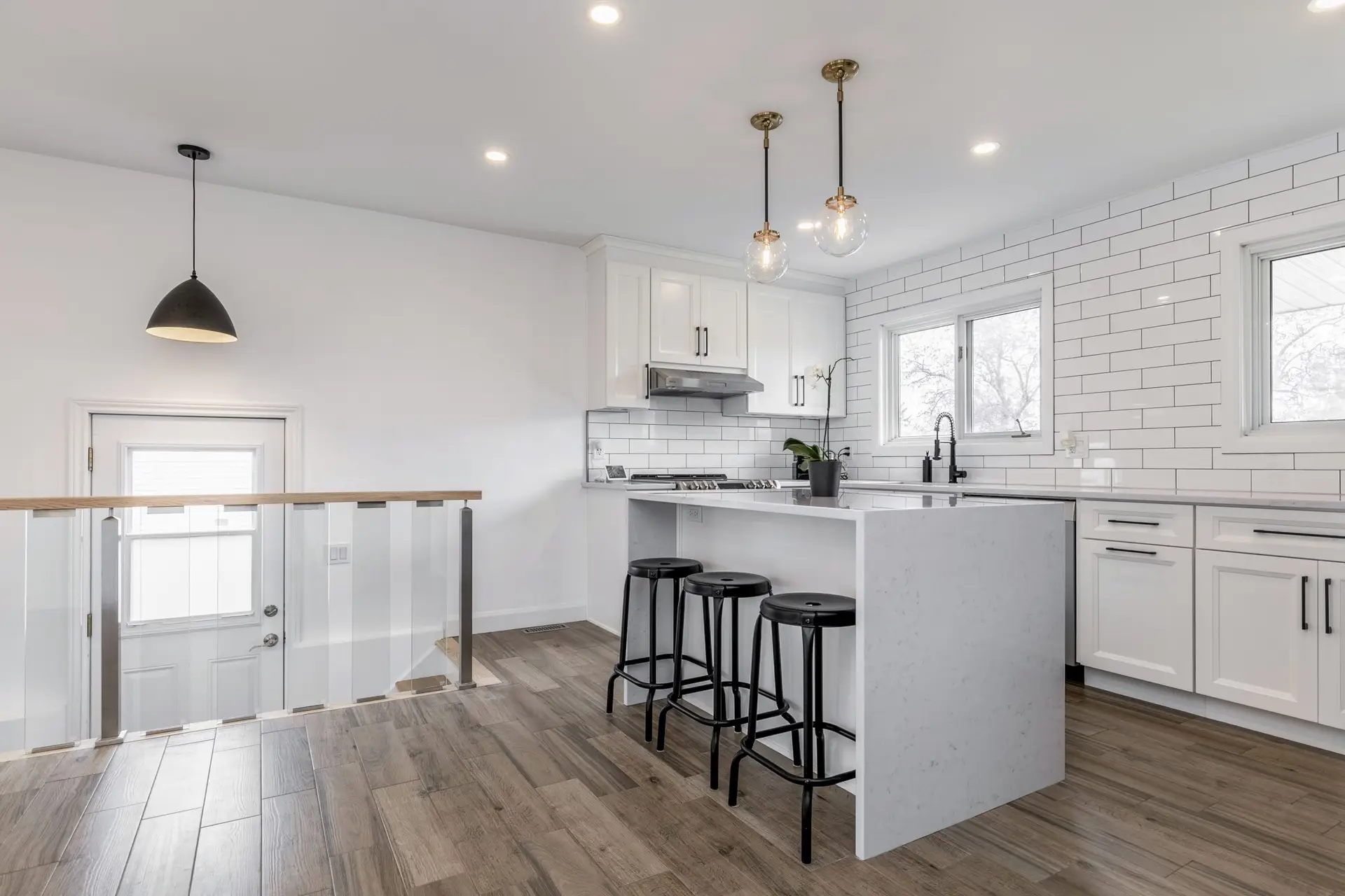 Pour faire place aux nouveaux matériaux, les vieilles armoires en bois à lattes branlantes, les carreaux de céramique vintage, les comptoirs en stratifié tachés et les robinets de travers ont été retirés de la scène.