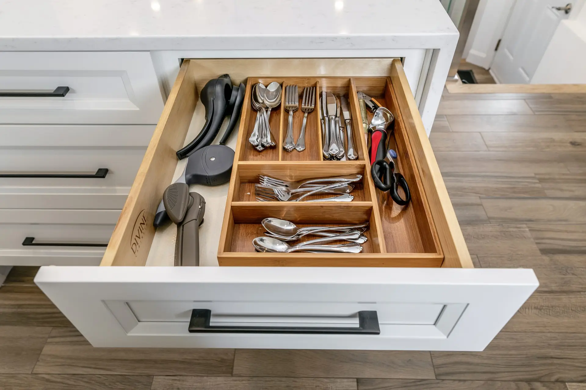 Les propriétaires ont opté pour un carrelage en céramique légèrement texturé, avec des touches de beige. Ces carreaux s’harmonisent parfaitement avec les armoires en bois et créent un joli contraste, évitant la monotonie d’un sol blanc traditionnel. Leur finition mate permet aussi d’équilibrer la brillance présente dans la pièce.