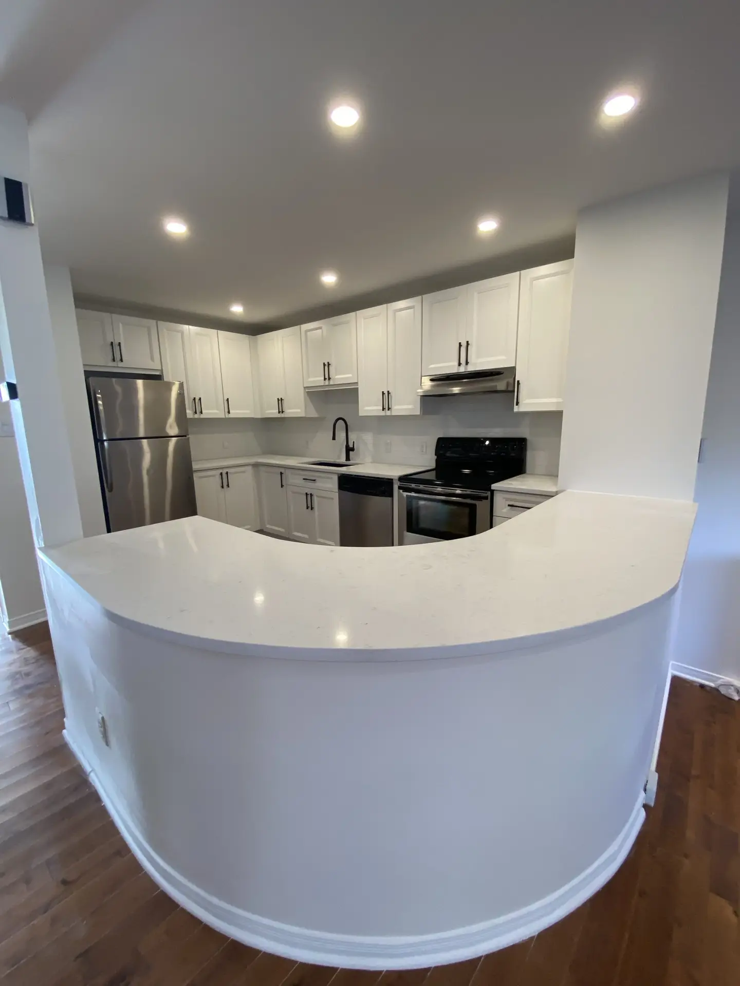 Pour faire place aux nouveaux matériaux, les vieilles armoires en bois à lattes branlantes, les carreaux de céramique vintage, les comptoirs en stratifié tachés et les robinets de travers ont été retirés de la scène.