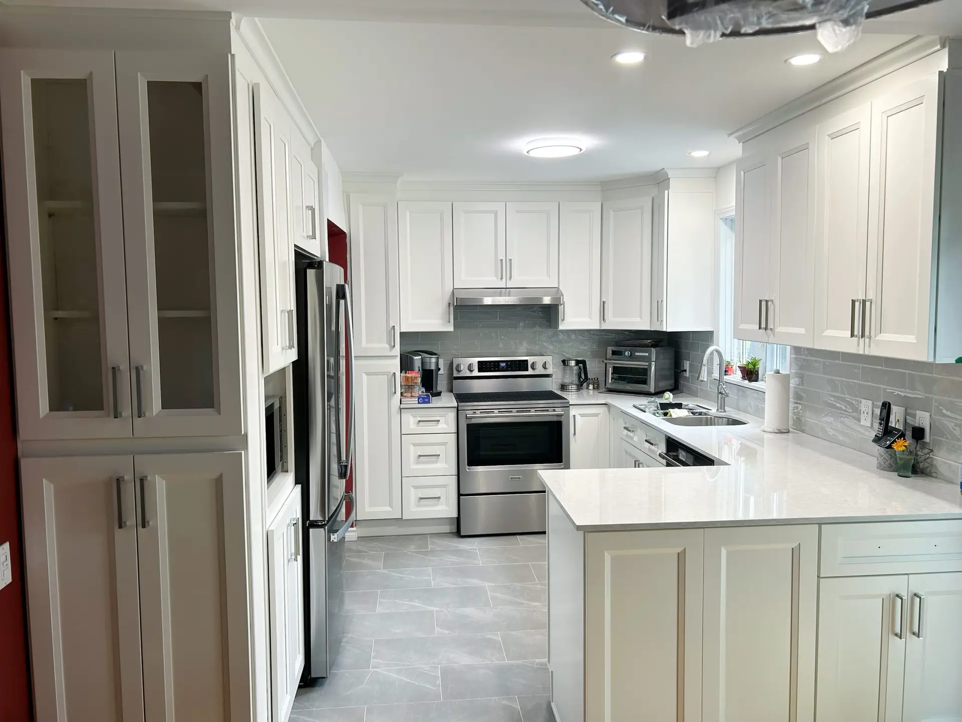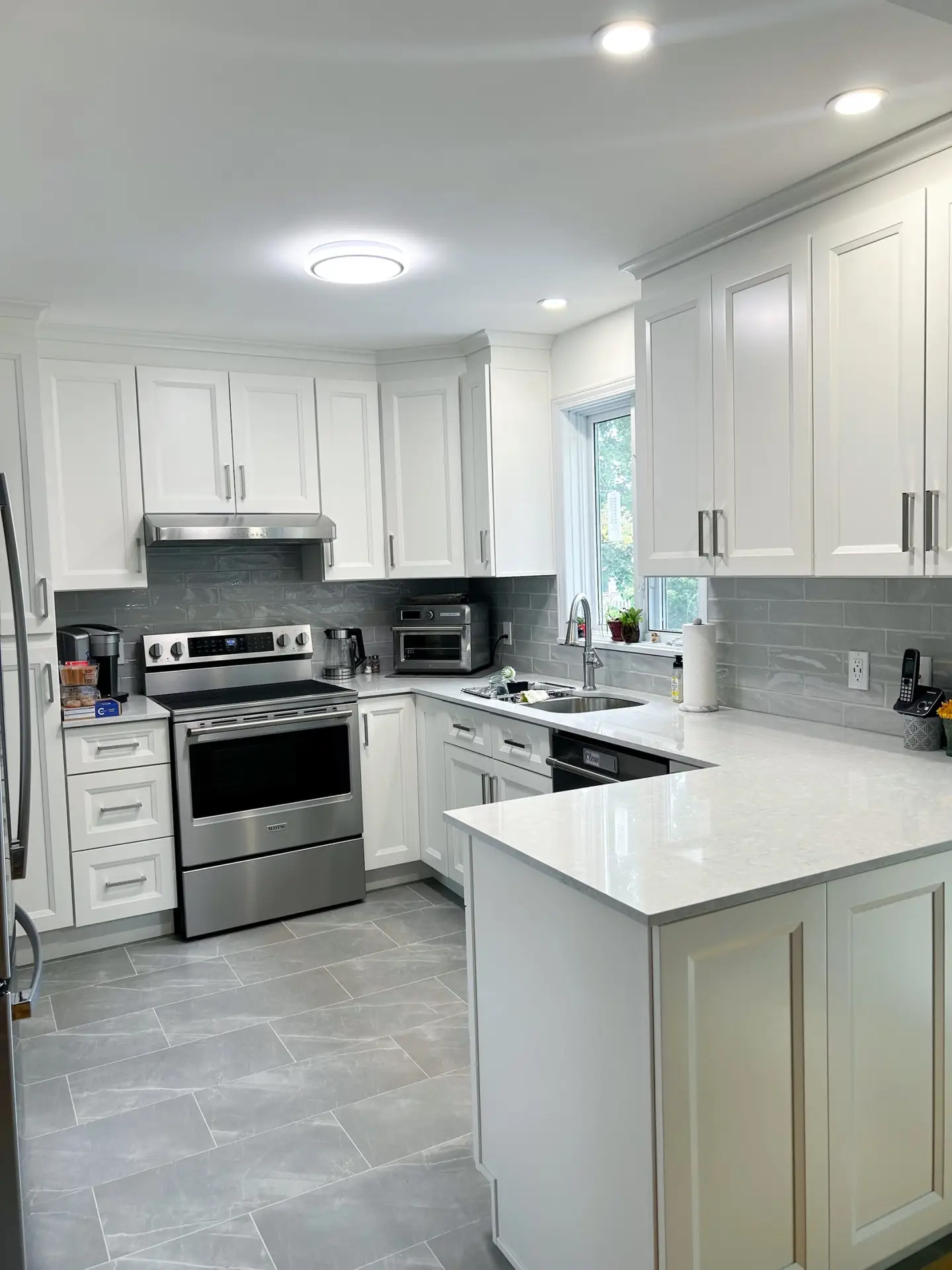 Les propriétaires ont opté pour un carrelage en céramique légèrement texturé, avec des touches de beige. Ces carreaux s’harmonisent parfaitement avec les armoires en bois et créent un joli contraste, évitant la monotonie d’un sol blanc traditionnel. Leur finition mate permet aussi d’équilibrer la brillance présente dans la pièce.