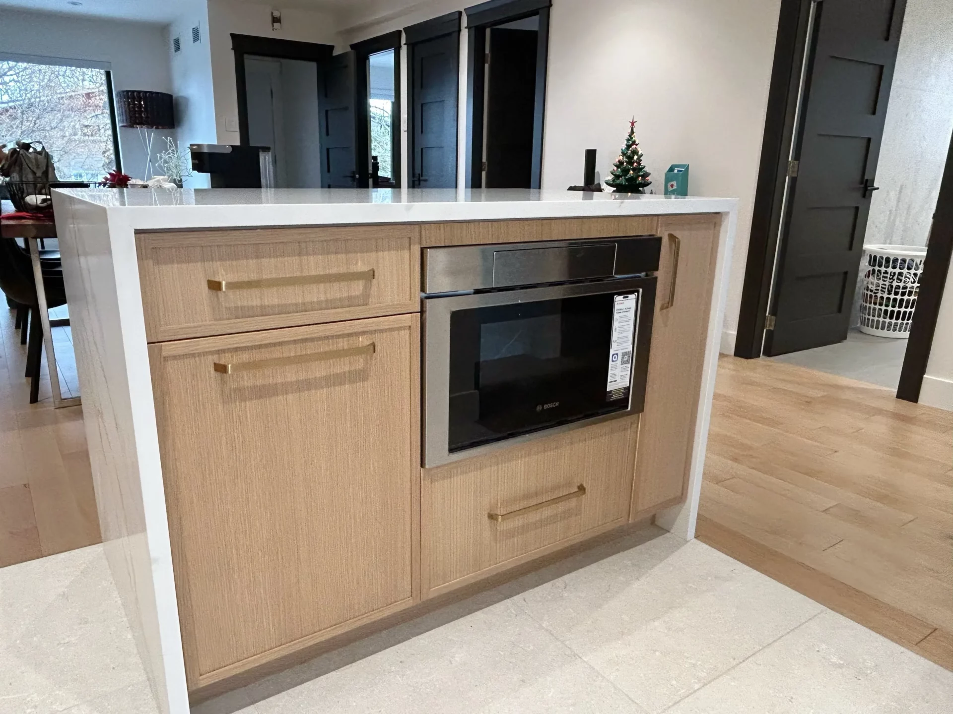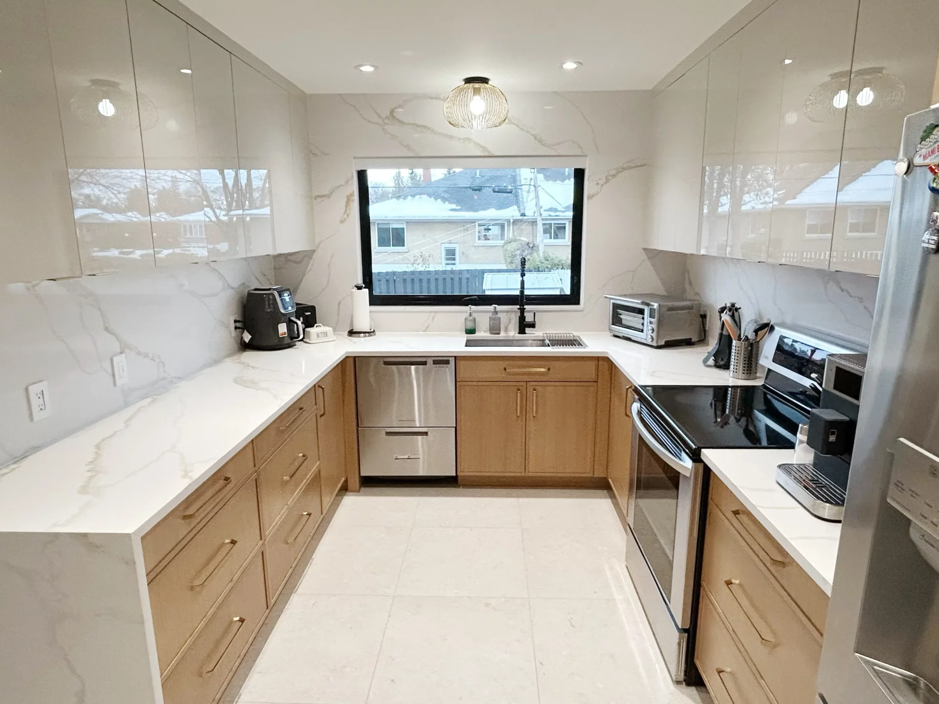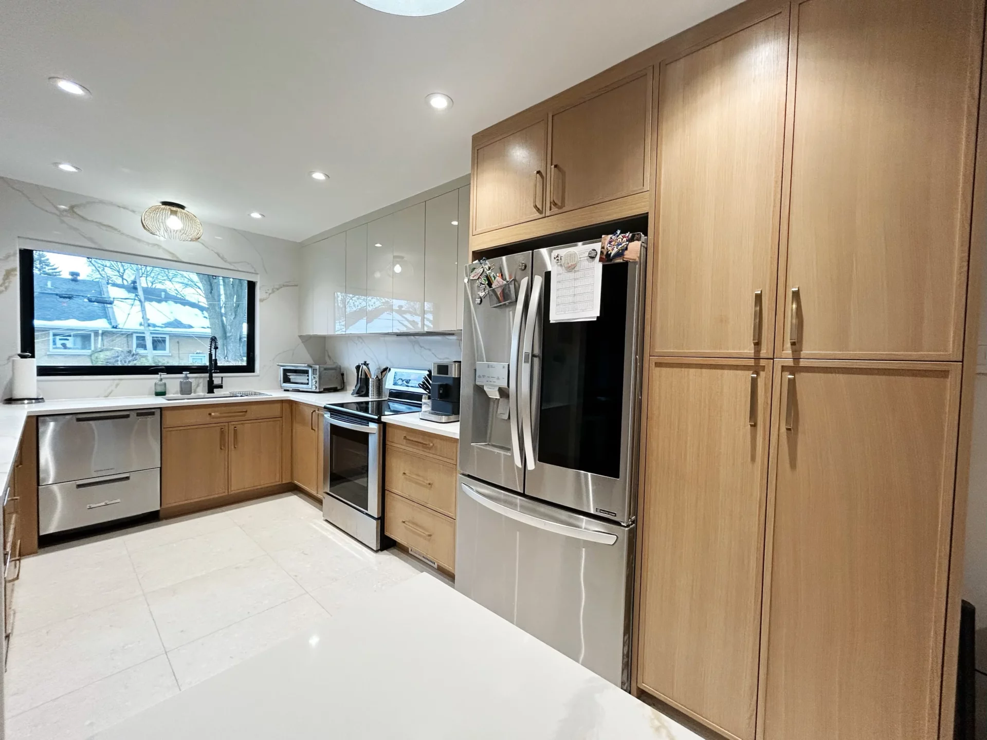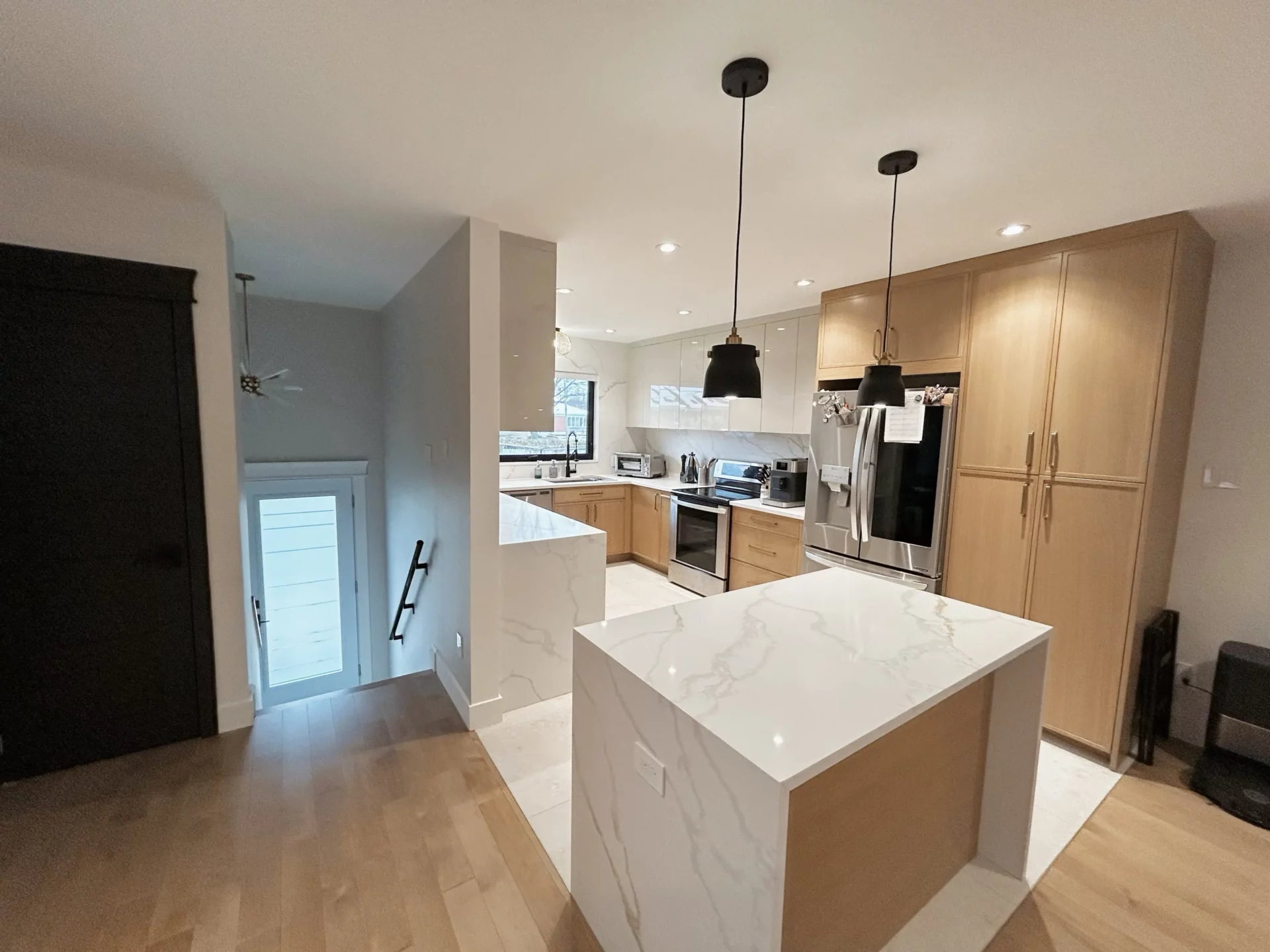 Cette transformation révèle une cuisine moderne et épurée de style Shaker, lumineuse et aérée. Nous avons remplacé les tons jaunes démodés par des armoires en bois massif à la finition naturelle, apportant chaleur et texture tout en conservant une palette claire. Un grand îlot central avec des comptoirs en quartz résistant offre un vaste espace de préparation et des places assises conviviales. L’aménagement optimise la fonctionnalité grâce à des rangements allant du sol au plafond et à une quincaillerie noire élégante, tandis que des suspensions et des spots encastrés modernes garantissent un espace ouvert, accueillant et hautement fonctionnel.