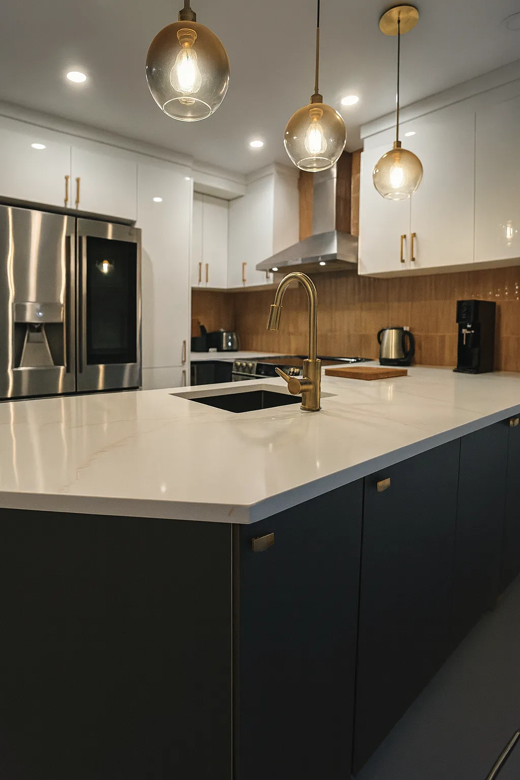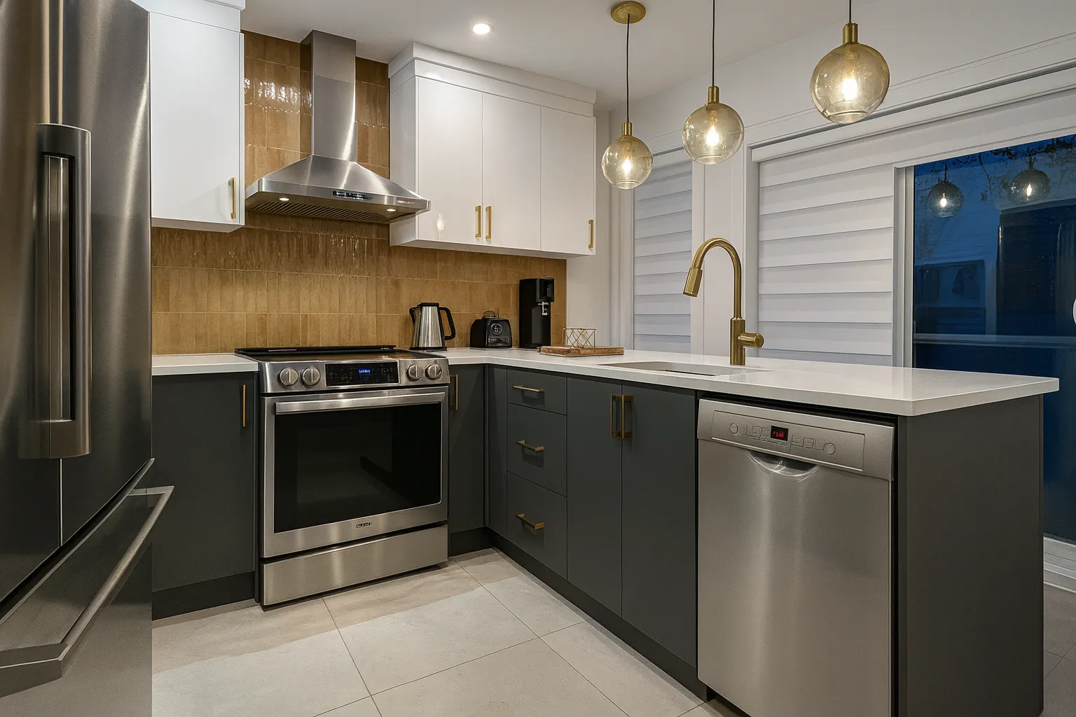 Cette superbe transformation de cuisine contemporaine moderne met en valeur une esthétique bicolore sophistiquée. Nous avons associé des armoires hautes blanc brillant pour maximiser la luminosité à des armoires basses gris mat pour structurer l’espace. Le design est sublimé par de luxueuses poignées dorées et des suspensions en verre du plus bel effet. Un élégant comptoir en quartz blanc offre un espace de travail durable, tandis que la crédence texturée imitation bois apporte une touche chaleureuse derrière la nouvelle hotte en acier inoxydable.