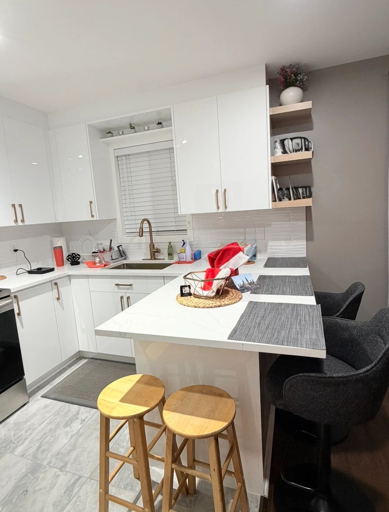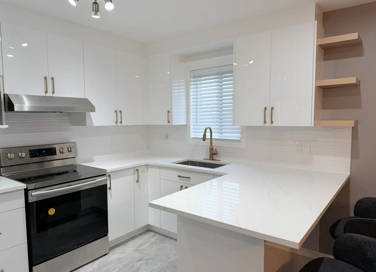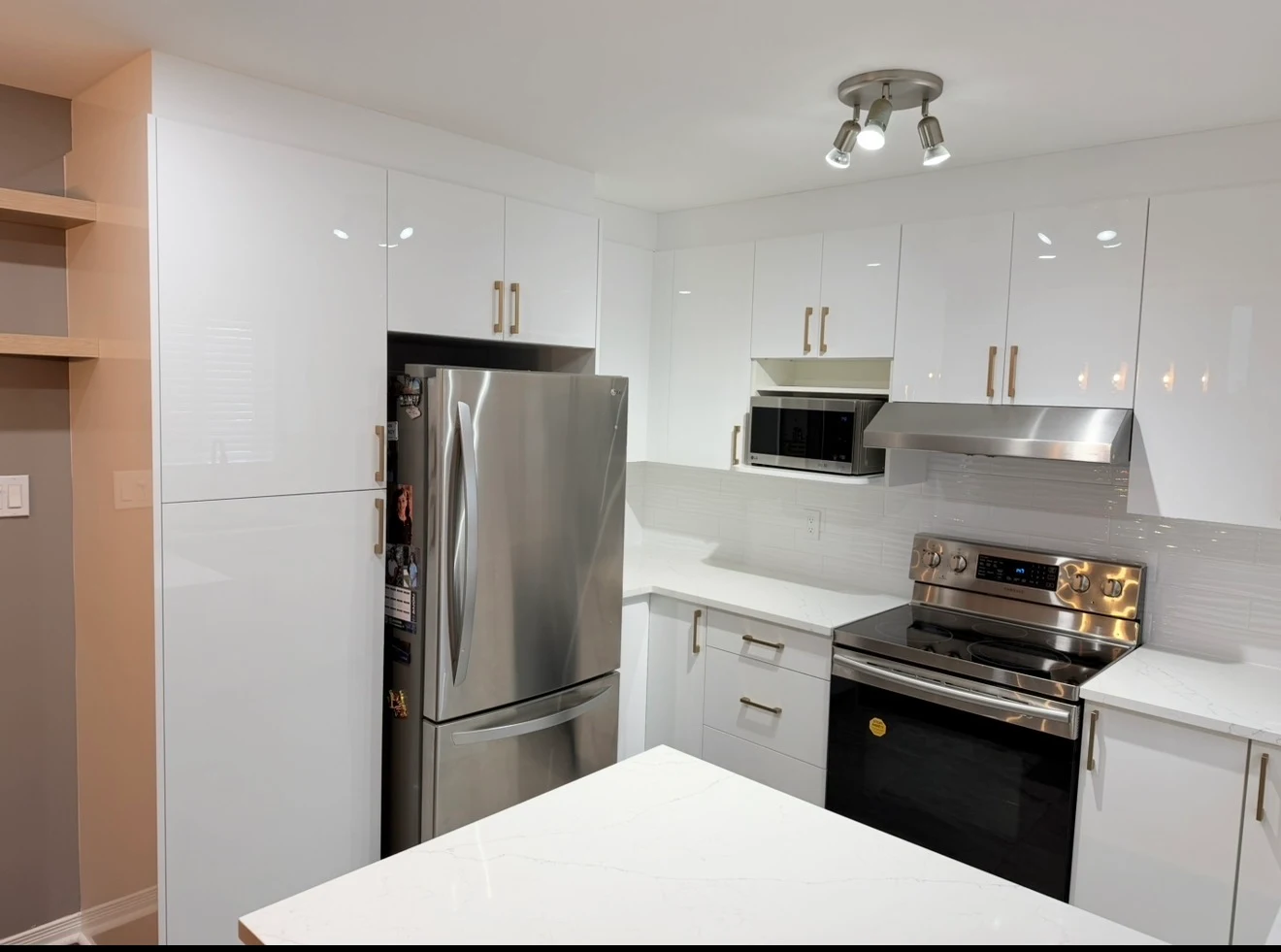 Cette élégante transformation, de style contemporain moderne, est caractérisée par la collection Blanc Brillant, qui illumine instantanément la pièce et l’agrandit visuellement. Le design met en valeur des armoires à panneaux plats laqués brillants pour un style minimaliste et épuré, rehaussé par des étagères ouvertes en bois sur mesure qui apportent chaleur et personnalité. Les comptoirs en quartz blanc immaculé et le dosseret assorti créent une continuité visuelle, tandis que les luminaires sur rail modernes soulignent l’atmosphère sophistiquée et aérée.